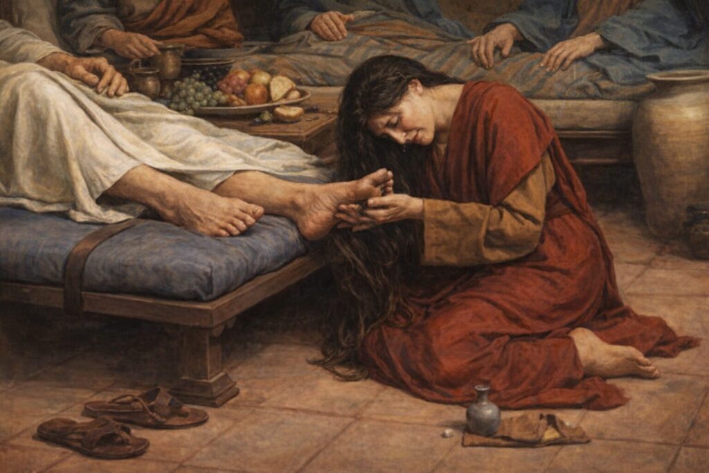 In first-century Judea, dinner guests reclined on cushions around a low platform, feet stretched out behind them. Such gatherings were semi-public, meaning outsiders could slip in and observe. This woman seized that opportunity. She entered a space where she did not belong, carrying one of her most precious possessions — an alabaster flask of expensive perfume.